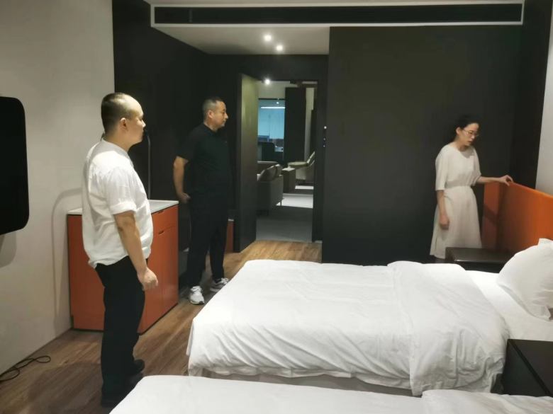 國慶假期期間,當很多公司放假后人們都攜帶一家老小外出游玩的時候,來自商洛丹鳳縣的酒店客戶放棄休假時間專程來到西安酒店家具生產廠家排名前三的博菲克酒店家具工廠,在廠里等候已經的博菲克總經理楊星親自熱情的接待。 這次過來之前,客戶順路先去了一趟我們博菲克九月份簽約的商洛某高端民宿工地現場,這里有我們已經做好的酒店家具正在交貨安裝。對于酒店客戶而言,選擇酒店家具廠家無可厚非的三個重點就是品質、價格和服務。當他們在商洛民宿項目仔細端詳著每一件家具工藝的時候,熱情的甲方也迎上前來主動扮演起了“推銷員”。“我們這個民