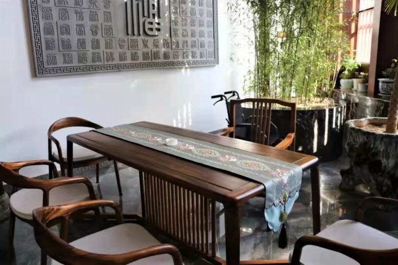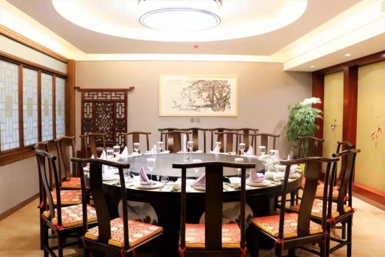 經(jīng)過多次溝通和討論,神木乾茂飯店宴會廳桌椅均采用中式風(fēng)格,餐椅選用官帽椅,整體實(shí)木結(jié)構(gòu)榫卯工藝。餐桌方面,為了考慮實(shí)用性和控制成本預(yù)算,最終敲定使用帶玻璃轉(zhuǎn)盤的圓桌,另外,根據(jù)空間的需要,在部分休息接待室配套了幾套茶臺供顧客喝茶使用。