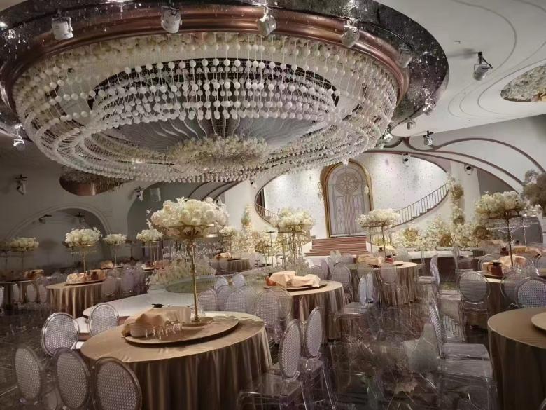 銅川吉富宴會中心餐桌椅及部分固裝家具由西安博菲克家具有限責任公司(簡稱:我公司)傾力生產,在我公司餐飲家具大客戶經理盧總的全權負責下,經過與設計師不斷地選材質、定款式,最終敲定了餐桌椅配套方案,交付到現場的餐桌椅也驚艷全場。