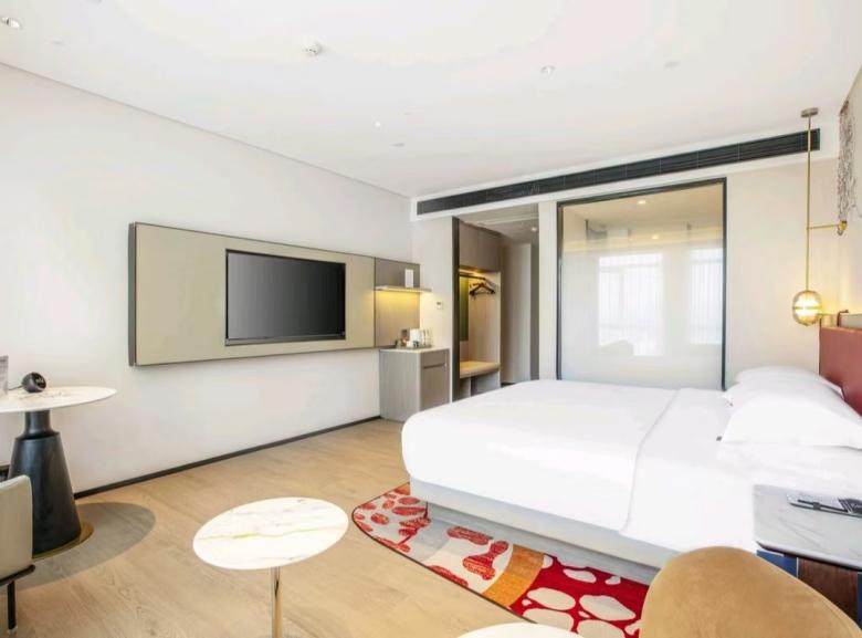 平涼歡閱酒店環保性好,床、柜等選用E0級板式家具,移動家具則由我廠負責搭配設計,與客房整體風格協調,并且更好的提升了室內空間的氛圍感和時尚感。
